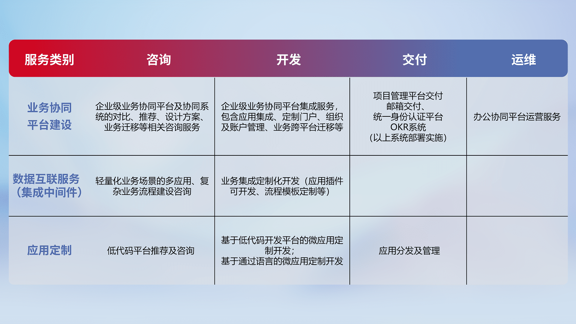 针对钉钉、、、企微、、、IDaas等平台级产品提供产品的规划、、、方案、、、、交付、、、定制化开发等服务,,,实现如统一协同办公、、智能客户服务、、、、混合会议管理、、、智能数据查询、、等业务场景,,实现数字化转型。。。。